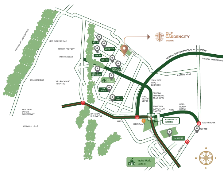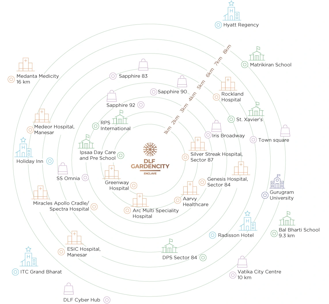 DLF Gardencity Enclave is situated at the core of a well-developed social ecosystem. All important destinations including schools, hospitals and retail hubs are only a five-minute drive, at most.
